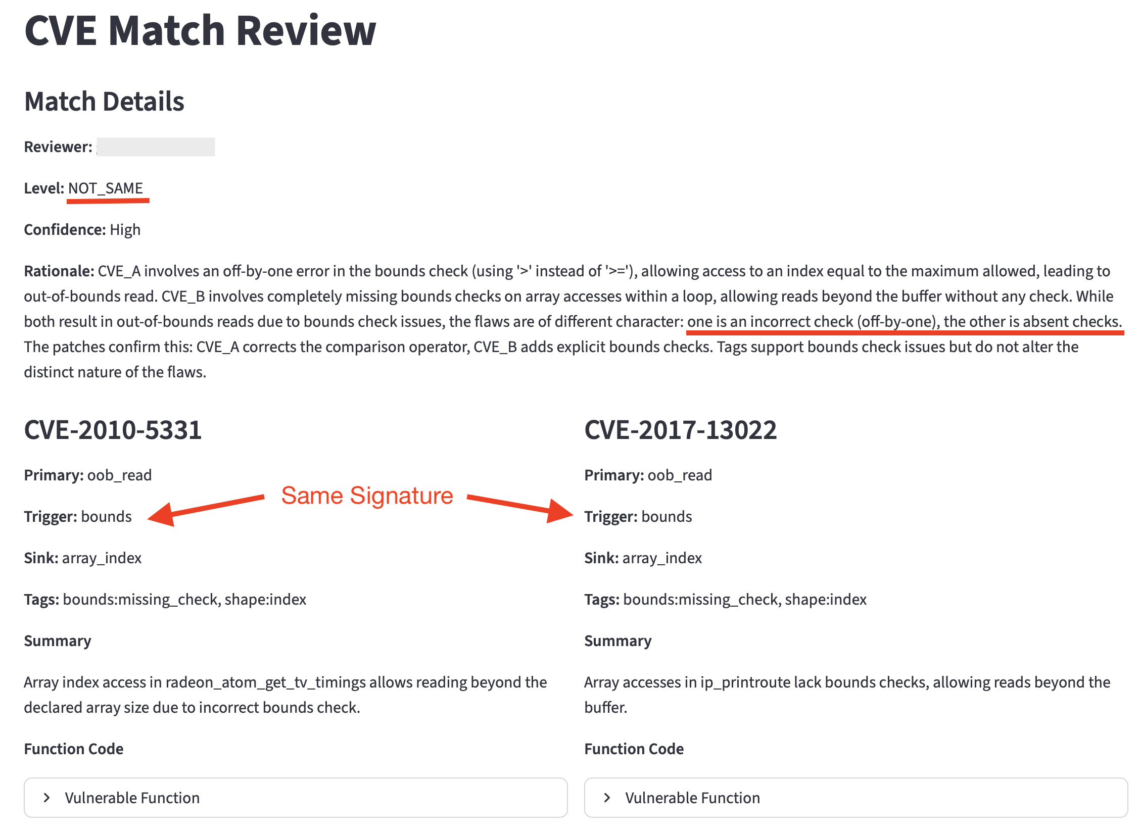 This decomposition separates the vulnerability mechanism from irrelevant details (patch shape, naming conventions, code style), and provides a basis for judgment that doesn’t depend on taxonomy labels.
