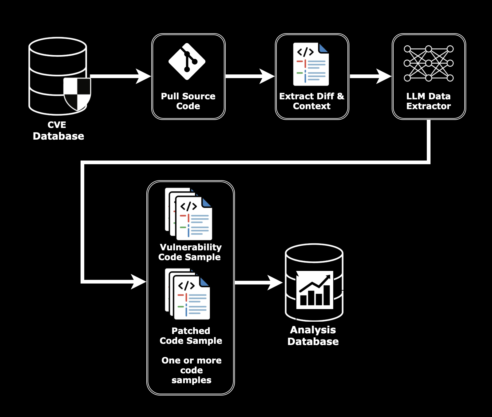 Although we start from CVEs, the unit of analysis in MemSafeEval is a vulnerable code sample: a patch local, function-level region sufficient to explain the bug and its fix. The process starts by querying all the CVEs that have weaknesses in any of the memory vulnerability categories. If the CVE has a git commit and that commit contains C or C++ the source code is downloaded. The vulnerable files plus the patch with the fix are given to an LLM to extract the code samples. A single CVE may yield zero, one, or multiple vulnerable samples, depending on how many distinct vulnerable sites are present. This distinction is important. CVEs are reporting artifacts; code samples are the objects that exhibit failure mechanisms and can be compared meaningfully. If no suitable vulnerable function can be identified, the model is instructed to return an insufficient_information message. The validated samples are then saved into a database for use in the next step of the process.