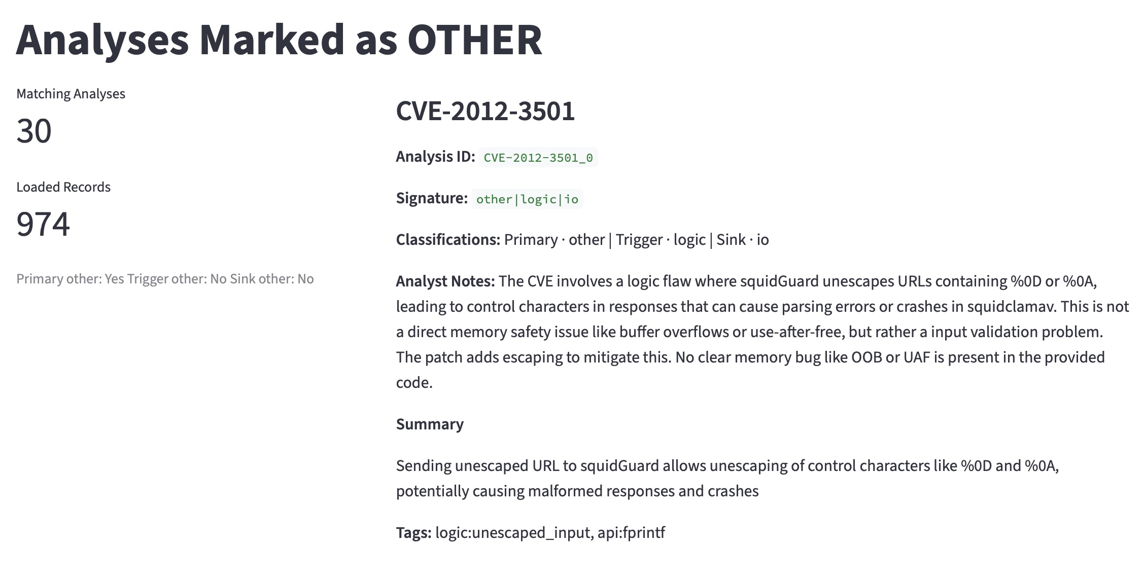 Equally important, the analysis process allows explicit refusal. When a code sample does not clearly demonstrate a memory-safety failure, it is marked as OTHER rather than coerced into an ill-fitting category. This prevents noise from propagating into later stages of comparison and training.